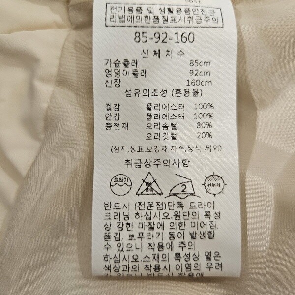제품소재 : 겉감-폴리에스터100%, 안감-폴리에스터100%, 충전재-오리솜털80%, 오리깃털20%