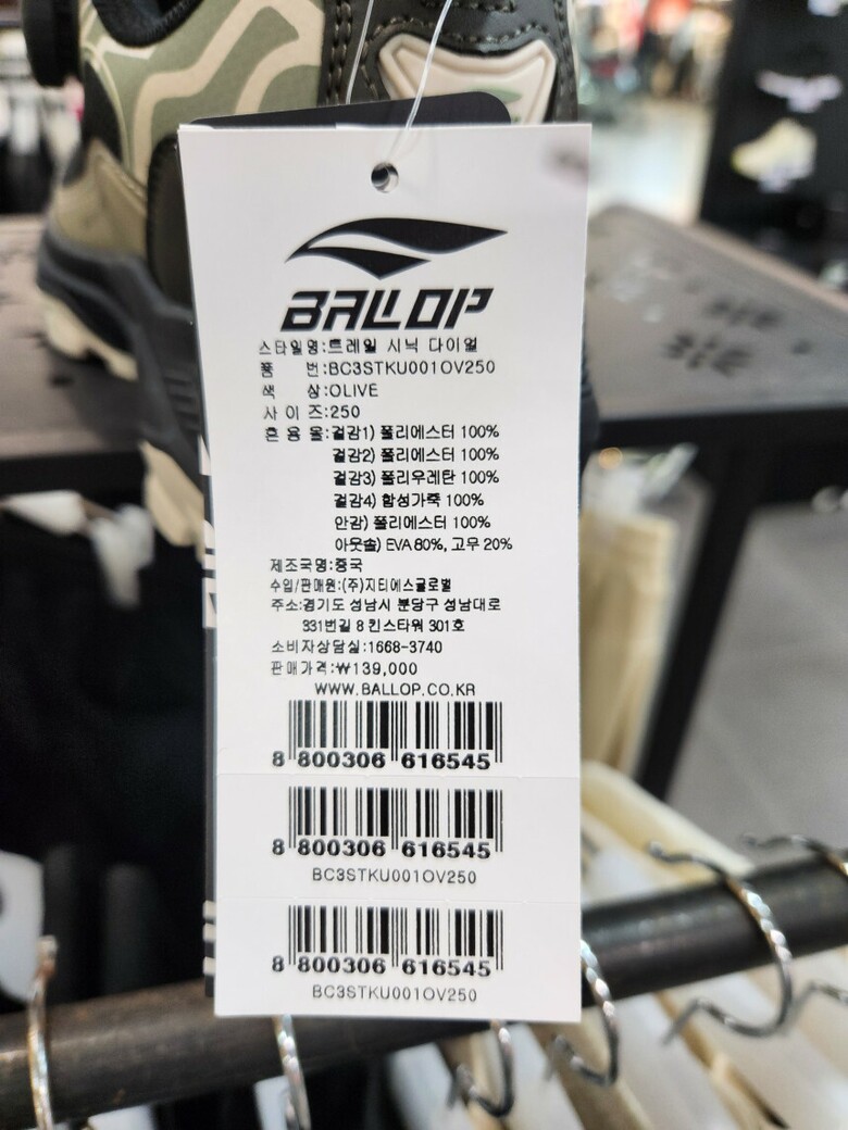 | 1. 제품 소재 (운동화인 경우에는 겉감, 안감을 구분하여 표시) | 배색:폴리에스테르, 고무 |