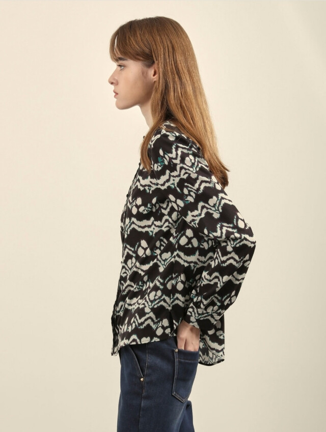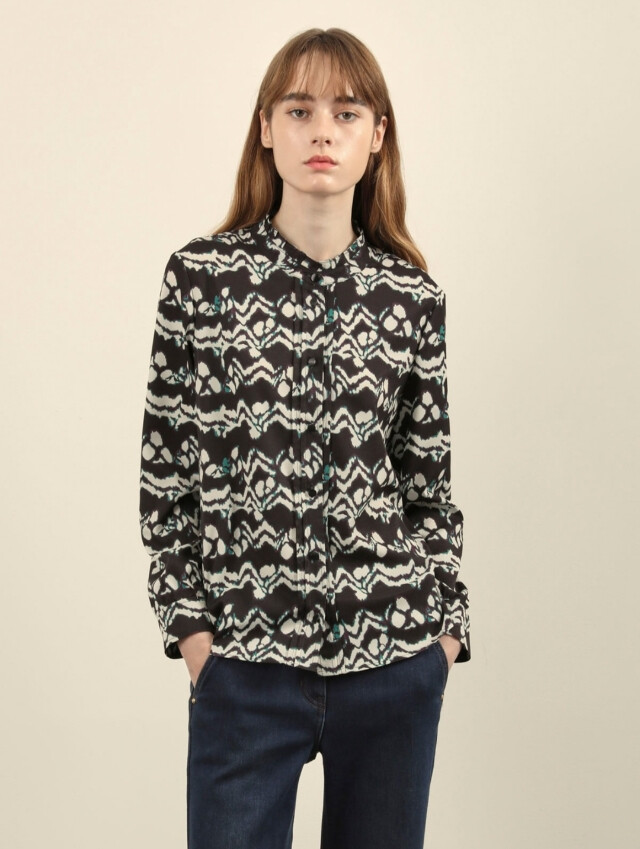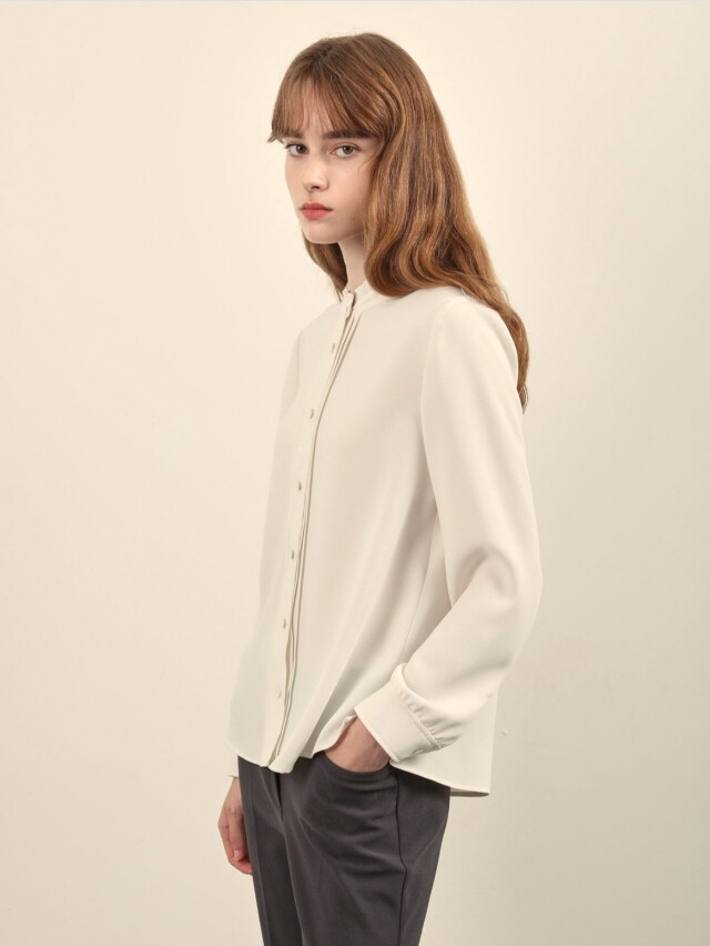 넥 라인에 프릴 주름을 잡아 여성스러움을강조하였고 앞 단짝 라인을 따라 패턴