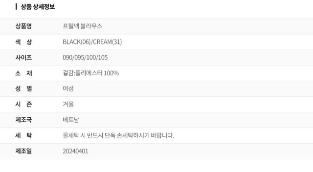 | 1. 제품 소재 (섬유의 조성 또는 혼용률을 백분율로 표시, 기능성인 경우 성적서 또는 허가서) | 상품상세참조 |